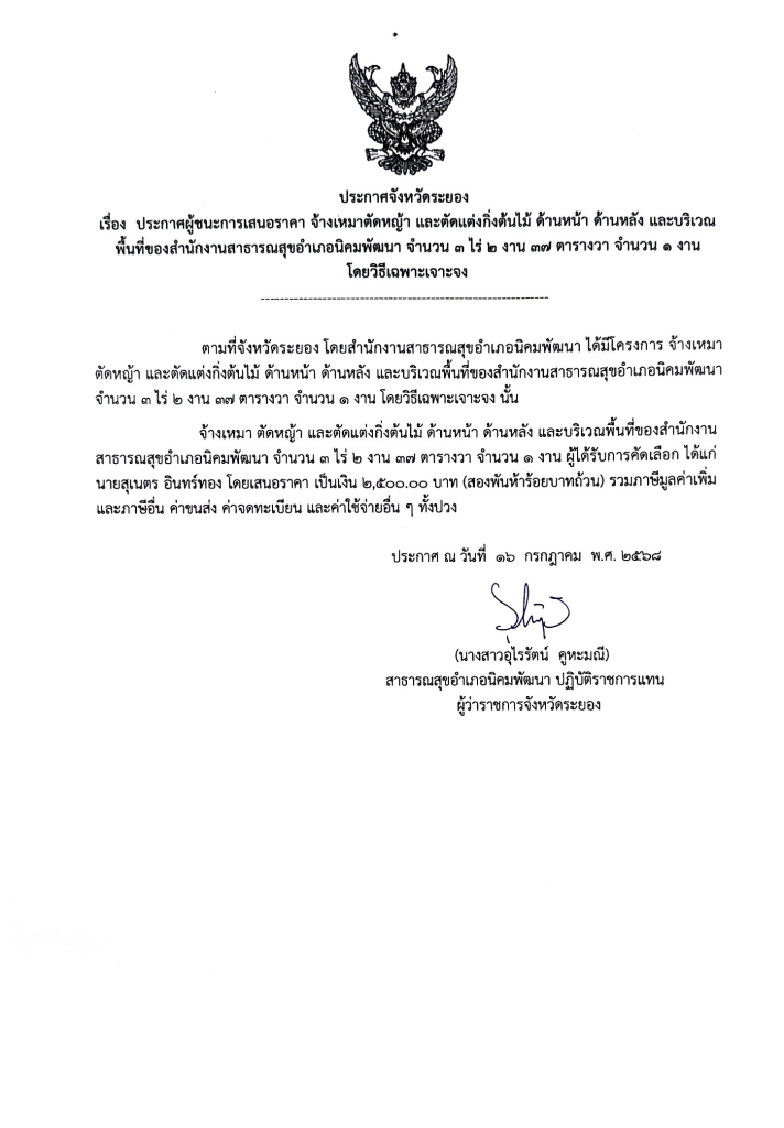 ประกาศผู้ชนะการเสนอราคา จ้างเหมาตัดหญ้า และตัดแต่งกิ่งต้นไม้ ด้านหน้า ด้านหลัง และบริเวณพื้นที่ของสำนักงานสาธารณสุขอำเภอนิคมพัฒนา จำนวน 3 ไร่ 2 งาน 37 ตารางวา จำนวน 1 งาน โดยวิธีเฉพาะเจาะจง