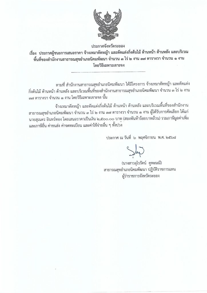 ประกาศผู้ชนะการเสนอราคา จ้างเหมาตัดหญ้า และตัดแต่งกิ่งต้นไม้ ด้านหน้า ด้านหลัง และบริเวณพื้นที่ของสำนักงานสาธารณสุขอำเภอนิคมพัฒนา จำนวน 3 ไร่ 2 งาน 37 ตารางวา จำนวน 1 งาน โดยวิธีเฉพาะเจาะจง