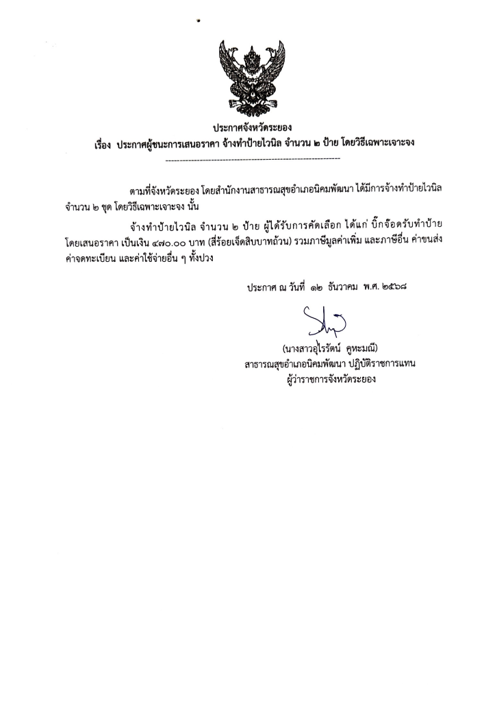 จัดซื้อ-จัดจ้างประกาศผู้ชนะการเสนอราคา จ้างทำป้ายไวนิล จำนวน 2 ป้าย โดยวิธีเฉพาะเจาะจง admin1 month ago4 weeks ago01 mins Post navigation Previous: ประกาศผู้ชนะการเสนอราคา จ้างเหมาตัดหญ้า และตัดแต่งกิ่งต้นไม้ ด้านหน้า ด้านหลัง และบริเวณพื้นที่ของสำนักงานสาธารณสุขอำเภอนิคมพัฒนา จำนวน 3 ไร่ 2 งาน 37 ตารางวา จำนวน 1 งาน โดยวิธีเฉพาะเจาะจงNext: เรื่อง ขออนุญาตประกาศเผยแพร่ผ่านเว็บไซต์ของหน่วยงานและปิดประกาศโดยเปิดเผย ณ สถานที่ปิดประกาศ Leave a Reply Cancel replyYour email address will not be published. Required fields are marked *Comment * Name * Email * Website Save my name, email, and website in this browser for the next time I comment.