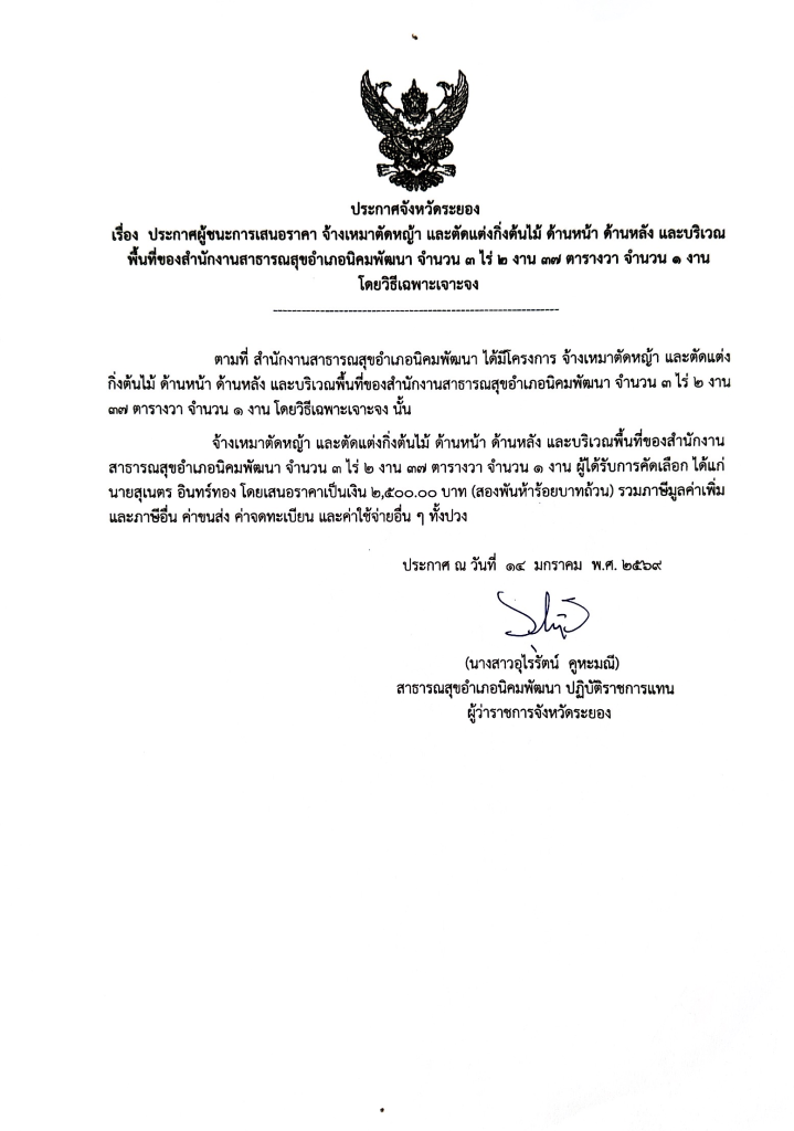 จัดซื้อ-จัดจ้างประกาศผู้ชนะการเสนอราคา จ้างเหมาตัดหญ้า และตัดแต่งกิ่งต้นไม้ ด้านหน้า ด้านหลัง และบริเวณพื้นที่ของสำนักงานสาธารณสุขอำเภอนิคมพัฒนา จำนวน 3 ไร่ 2 งาน 37 ตารางวา จำนวน 1 งาน โดยวิธีเฉพาะเจาะจง admin2 days ago4 hours ago01 mins Post navigation Previous: ประกวดราคาซื้อรถบรรทุก (ดีเซล) ขนาด 1 ตัน ปริมาตรกระบอกสูบไม่ต่ำกว่า 2,400 ซีซี หรือกำลังเครื่องยนต์สูงสุดไม่ต่ำกว่า 110 กิโลวัตต์ ขับเคลื่อน 4 ล้อ แบบดับเบิ้ลแค็บ จำนวน 1 คัน ด้วยวิธีประกวดราคาอิเล็กทรอนิกส์ (e-bidding)Next: ประกาศจังหวัดระยอง เรื่องประกาศผู้ชนะการเสนอราคา จ้างปรับปรุงภูมิทัศน์สำนักงานสาธารณสุขอำเภอนิคมพัฒนา สำนักงานสาธารณสุขอำเภอนิคมพัฒนา ตำบลนิคมพัฒนา อำเภอนิคมพัฒนา จังหวัดระยอง จำนวน 1 รายการ โดยวิธีเฉพาะเจาะจง Leave a Reply Cancel replyYour email address will not be published. Required fields are marked *Comment * Name * Email * Website Save my name, email, and website in this browser for the next time I comment.